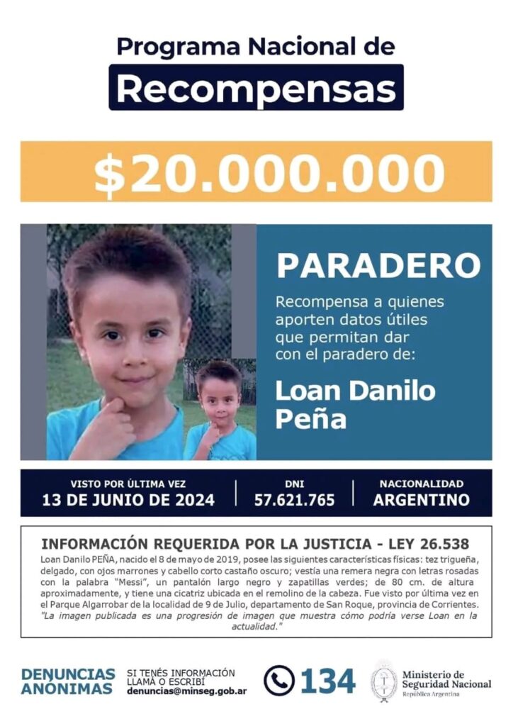 El Gobierno nacional mantiene vigente una recompensa de $20.000.000 para quienes aporten datos útiles que permitan dar con el paradero de Loan Danilo Peña, el niño correntino que permanece desaparecido desde junio de 2024. La medida forma parte del Programa Nacional de Recompensas impulsado por el Ministerio de Seguridad de la Nación Argentina.